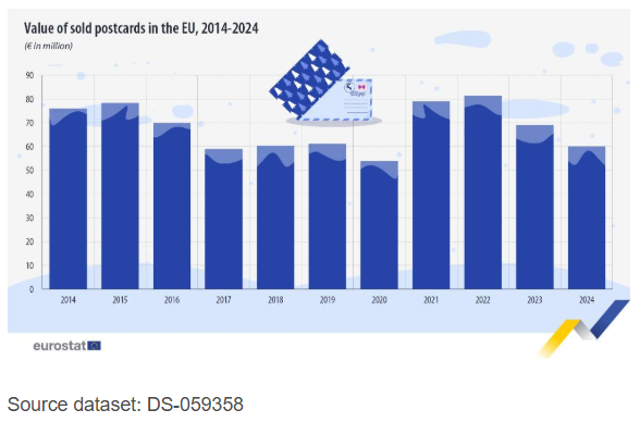 据欧盟统计局官方消息,2024年,欧盟(EU)明信片销售额为6000万欧元,较2023年的6900万欧元下降了15%。自2014年以来,明信片销售额呈现下降趋势,但在全球疫情期间,该数值有所回升,并达到过去十年的最高水平。2020年至2021年间,明信片销售额增长近50%,2022年达到峰值8130万欧元。