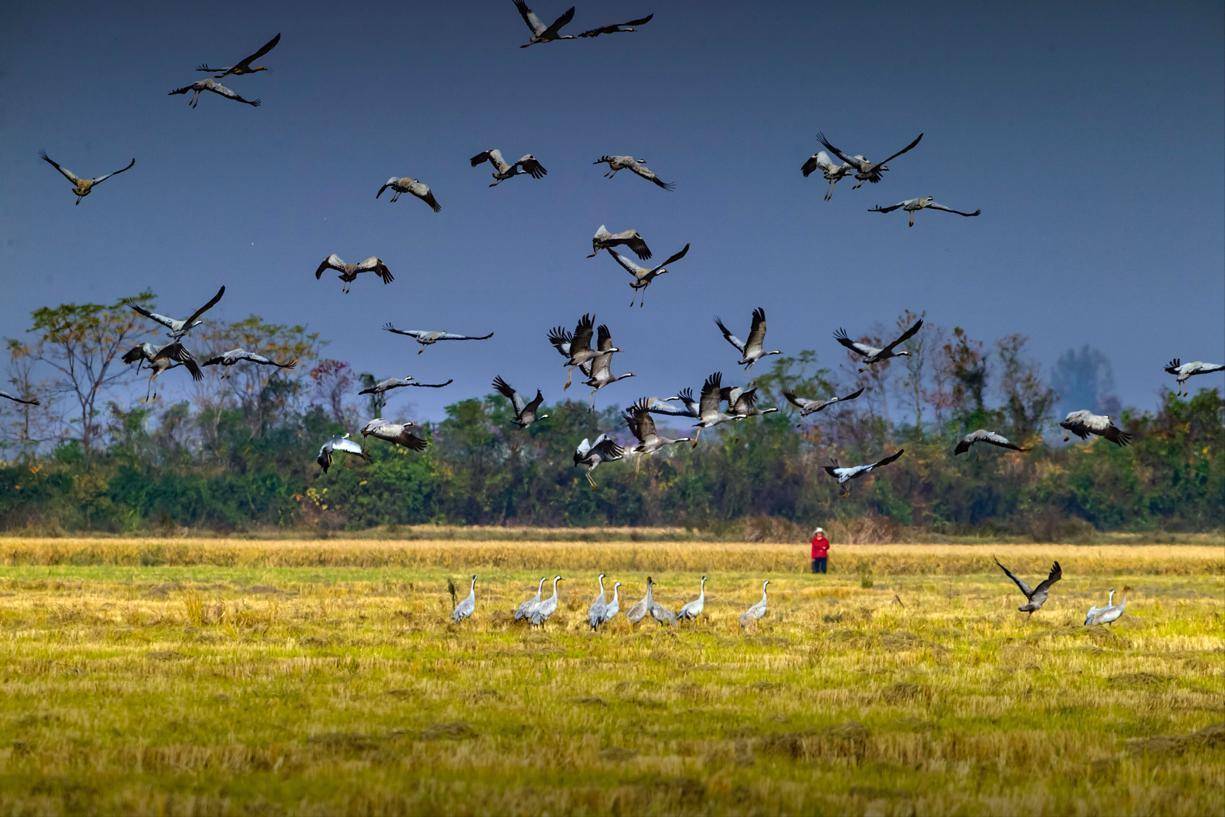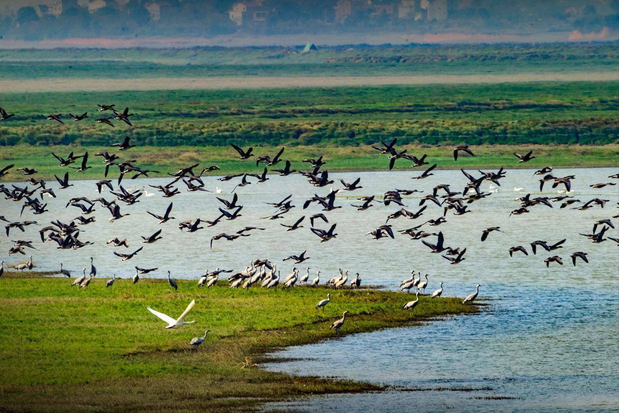 据统计,在众多候鸟中,全球95%以上的白鹤、80%以上的东方白鹳、70%以上的白枕鹤都选择在此越冬,使鄱阳湖成为名副其实的“候鸟国际机场”。